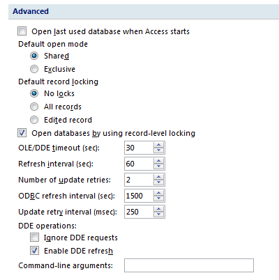 Also, to clarify your input regarding RecordLevel Locking, this should be set as shown, correct (Open db using record level locking)?