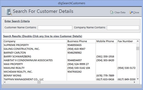 WHERE (([Customers Extended].ID)<>Form!ID) And (([Customers Extended].[Customer Name]) Like "*" & [txtCustNameContains] & "*") And (([Customers Extended].[Company]) Like "*" & [txtCompanyNameContains] & "*")