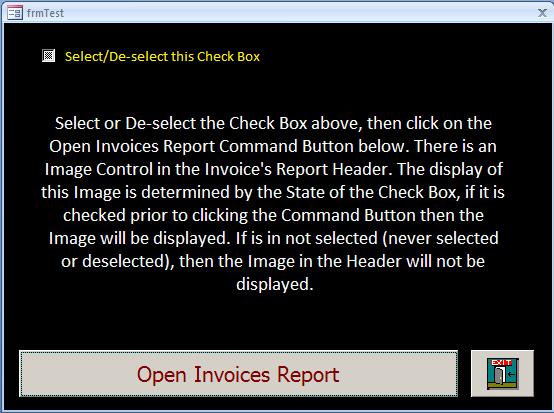 Code:Private Sub cmdOpenReport_Click() DoCmd.OpenReport "Invoices", acViewPreview, , , acWindowNormal, IIf(IsNull(Me![chkShowSignature]), 0, Me![chkShowSignature].Value) End Sub