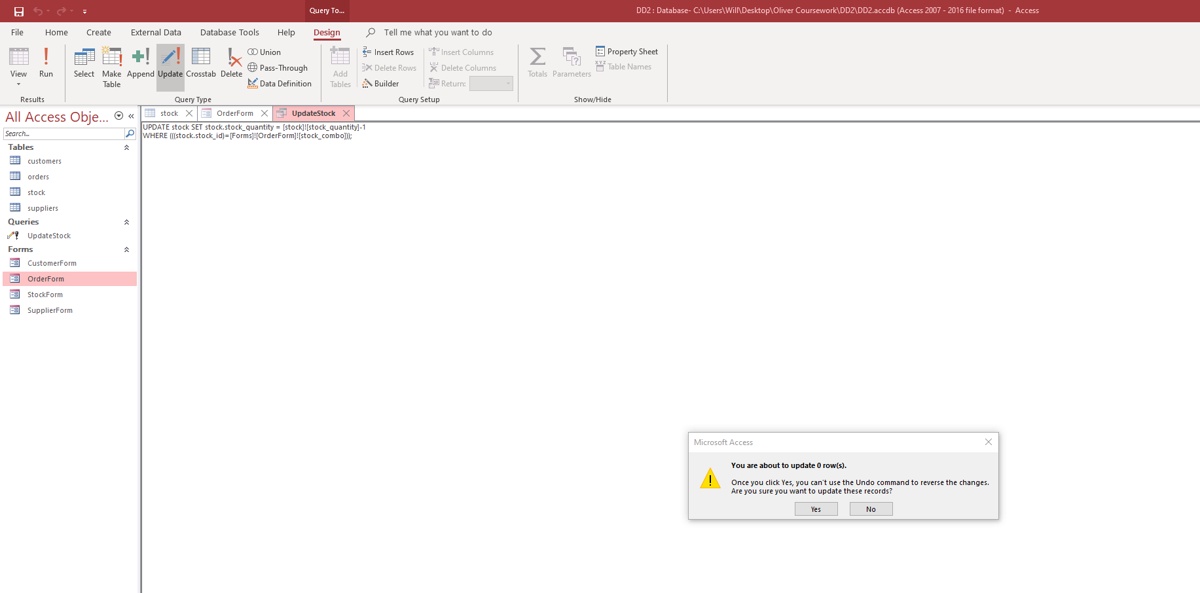 The problem is that when I try and reference the form in my update query nothing happens, I simply get a prompt when I execute it saying "You are about to update 0 row(s)", I've tried taking out the "Where" clause from my query and it will subtract 1 from all the stock.stock_qua ntity records so I know its not a problem with the SET clause.
