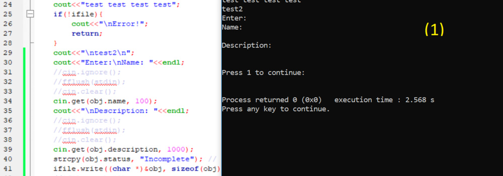 [Screenshot 1] The screen is not stopping on cin.get() functions for the user to input something. Maybe automatically taking the "enter key" from the buffer.