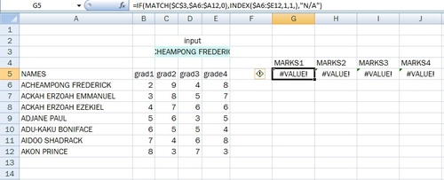 I have a range of cells containing names in A6:A12. I also have corresponding values in columns B,C,D and E. I want to compare the value of C3 to see if it matches in the names then extract the corresponding values in B,C,D,E and placed them in column G,H,I, and J. This is the formula I used