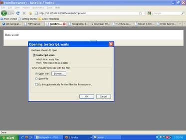 I am developing a WAP apllication with WML2.0 and wants to use WMLSCRIPT in my application but some my problems occur ..I use all MIME Types that support wml script.I am using Apache and i include following MIME Types