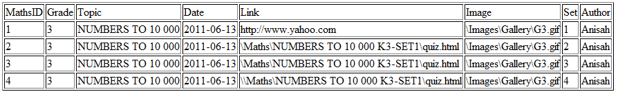 Example, the LINK coloum calls for www.yahoo.com, \Maths\NUMBERS TO 10 000 K3-SET1\quiz.html, etc.