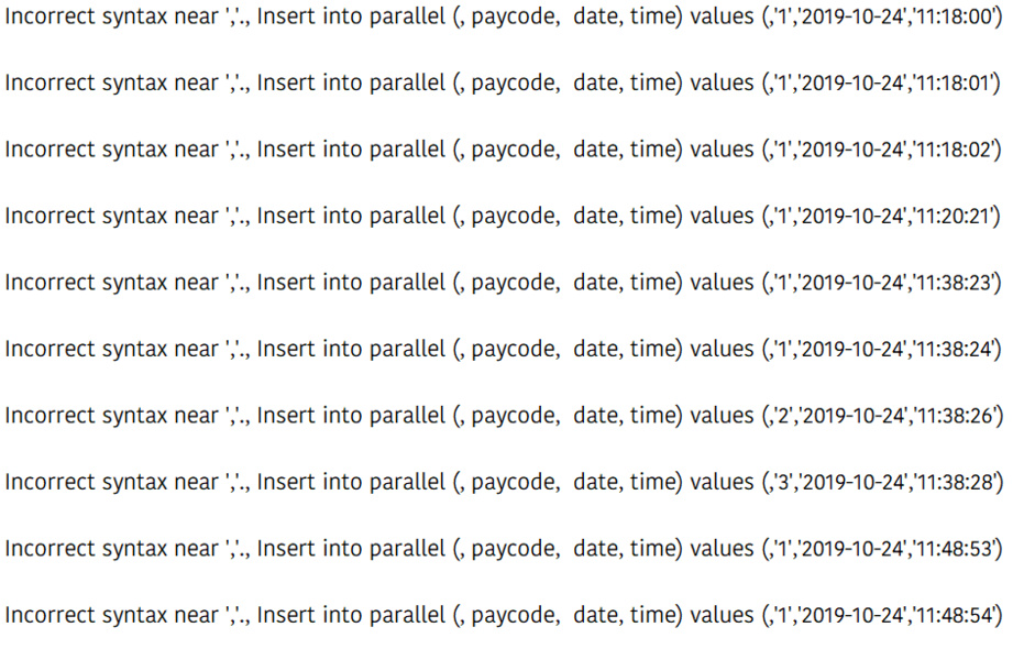 Incorrect syntax near ','., Insert into parallel (, paycode, date, time) values (,'3'